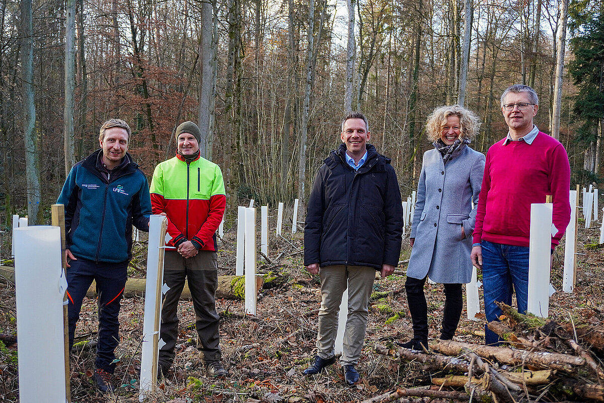 Der Stadtwalddistrikt Hohberg, der sich in unmittelbarer Nachbarschaft zu Dentaurum in Ispringen befin-det, leidet aufgrund seines kalkreichen Untergrundes seit rund sechs Jahren massiv unter der Trocken-heit infolge des Klimawandels. Wo einst noch 120-jährige Weißtannen standen, wurde jetzt die nächste Generation Wald angepflanzt. Mit der Pflanzung der heimischen Wildobstsorte Elsbeere, welche Hitze und Trockenheit besser verträgt als viele andere unserer einheimischen Baumarten, wurde ein weiterer Schritt in Richtung klimastabiler Wald von morgen getan. Eine Neuheit bei dieser Pflanzung sind die voll-ständig biologisch abbaubaren Wuchshüllen, die aus einem komplett mikroplastikfreien Bio-Kunststoff bestehen. „Diese Wuchshüllen sind notwendig, um die zarten Triebe der jungen Bäume vor Wildverbiss zu schützen. Sobald die Pflanzen eine Höhe von eineinhalb bis zwei Metern erreicht haben, werden sie wieder abgebaut und weiterverwendet“, erläutert Seefelder.
