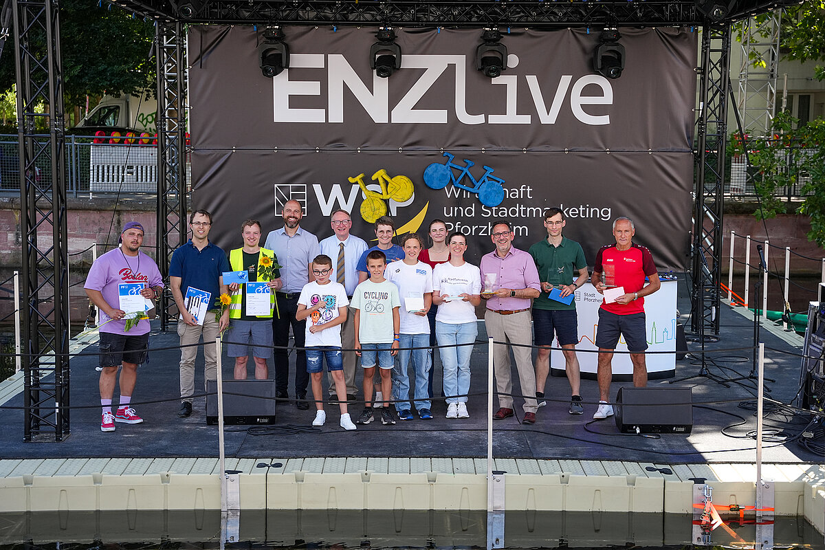 Vom 16. Mai bis 5. Juni haben Pforzheimerinnen und Pforzheimer wieder kräftig in die Pedale getreten: 1.113 Personen sind im Rahmen der diesjährigen Stadtradeln-Aktion drei Wochen lang für Pforzheim aufs Fahrrad gestiegen. Damit war die Beteilung so hoch wie noch nie. Am Freitag, 18. Juli, prämierte Umweltbürgermeister Tobias Volle die Gewinnerinnen und Gewinner des Stadtradeln-Wettbewerbs auf der schwimmenden Bühne der Veranstaltungsreihe Enz live.
