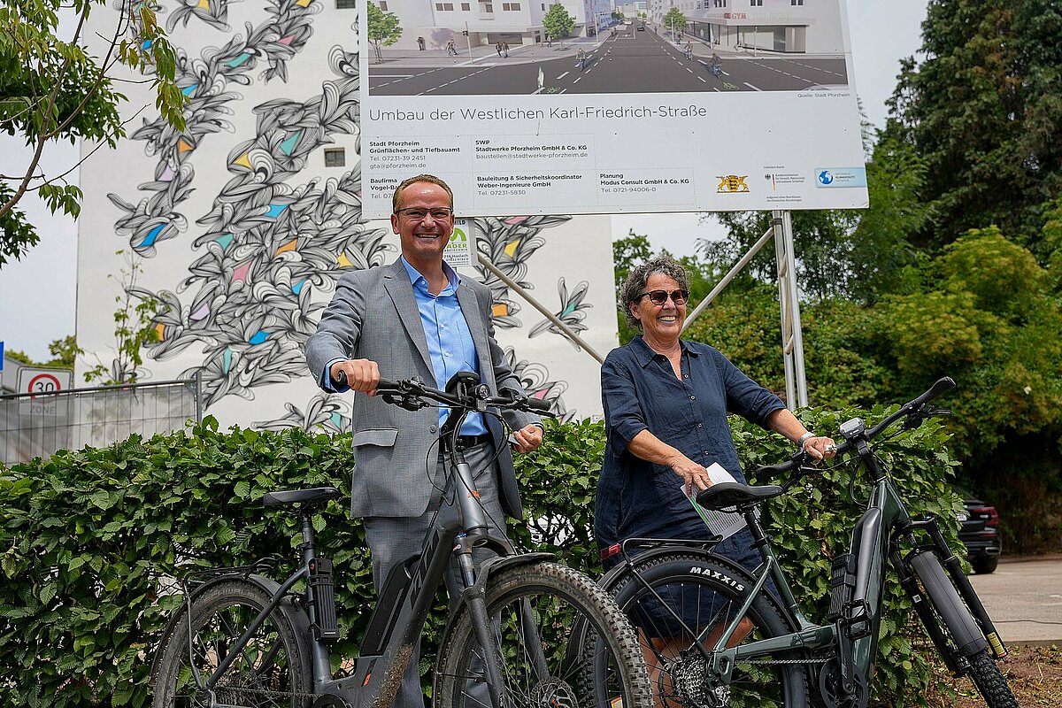 Heute ist eine der wichtigsten Verkehrsachsen im Stadtgebiet Pforzheim nach zwei Jahren Bauzeit offiziell wieder freigegeben worden. Rund 1,3 Kilometer der Westlichen Karl-Friedrich-Straße wurden in den vergangenen Jahren bereits mit finanzieller Unterstützung des Landes Baden-Württemberg und des Bundes umgestaltet. Nun steht der vierte und schwierigste Bauabschnitt, der sich vom Haus der Jugend bis zum Leopoldplatz erstreckt, bevor. Der Beginn dieser letzten Maßnahme im Zuge des Umbaus der Westlichen soll 2024 beginnen. „Auch wenn wir noch nicht ganz fertig sind, nach zwei Jahren und 1,3 Kilometer liegt der Mammutanteil der Maßnahme hinter uns“, gibt Oberbürgermeister Peter Boch den Startschuss für die offizielle Verkehrsfreigabe. „Für die bewilligten Fördergelder möchte ich mich, auch im Namen meiner Bürgermeisterkollegin Sibylle Schüssler, beim Bund sowie beim Land Baden-Württemberg bedanken, aber natürlich auch bei unseren Bundes- und Landtagsabgeordneten, dies sich zuvor für diese finanziellen Beiträge stark gemacht hatten “, betont Oberbürgermeister Peter Boch. „Heute geben wir die Bauabschnitte eins bis drei frei, und wünschen allen Radfahrerinnen und Radfahrern eine gute Fahrt auf dem neuen Radschutzstreifen. Es ist toll, dass wir es mit der Umbaumaßnahme nicht nur geschafft haben, eine der wichtigsten Radverkehrsachsen zu stärken, sondern auch die gesamte Aufenthaltsqualität in der Westlichen zu steigern“, schließt sich Umwelt- und Baudezernentin Sibylle Schüssler an. Mit dem Umbau der Westlichen hat die Stadt Pforzheim damit nicht nur einen weiteren Beitrag zur Förderung nachhaltiger Mobilität in der Stadt, sondern auch zur Klimafolgenanpassung erbracht.