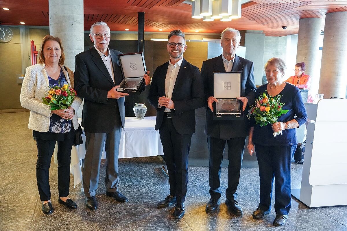 Oberbürgermeister Peter Boch (Mitte) ehrt Peter Wagner (links) und Reiner Lichtenberger (rechts) mit der Portusmedaille für besonderes ehrenamtliches Engagement um die Stadt Pforzheim. Mit auf dem Foto sind die beiden Ehefrauen Sabine Wagner (links) und Karin Lichtenberger (rechts).