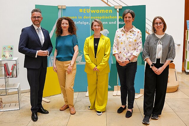 Oberbürgermeister Peter Boch, Referentin Dr. Lana Mayer, Ramona Jonait (Stadtbibliothek Pforzheim), Europabeauftragte Anna-Lena Beilschmidt, Gleichstellungsbeauftragte Lea Niewerth