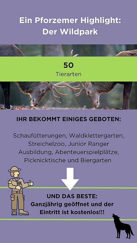 Übrigens – wer hätte es gedacht – gehört ein besonderes Pforzemer Highlight auch zum Themenbereich Kultur: der Wildpark! Hier könnt Ihr 50 verschiedene Tierarten entdecken und bekommt auch darüber hinaus Einiges geboten: Schaufütterungen, Waldklettergarten, Streichelzoo, Abenteuerspielplätze und Picknicktische. Ein Biergarten lädt vor allem im Sommer zum Verweilen ein. Doch das Beste ist: der Wildpark ist ganzjährig geöffnet und der Eintritt ist kostenlos. Also nichts wie hin!