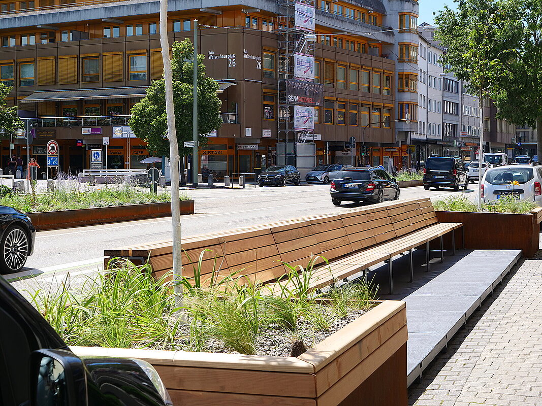 - Die geplanten Aufenthaltsbereiche, sogenannte Parklets, bestehen aus modularen Sitzmöglichkeiten und Grünelementen. Sie sind direkt am Fahrbahnrand angeordnet. Die hohen Rückwände an den Sitzelementen bieten dabei Schutz vor dem Verkehr.