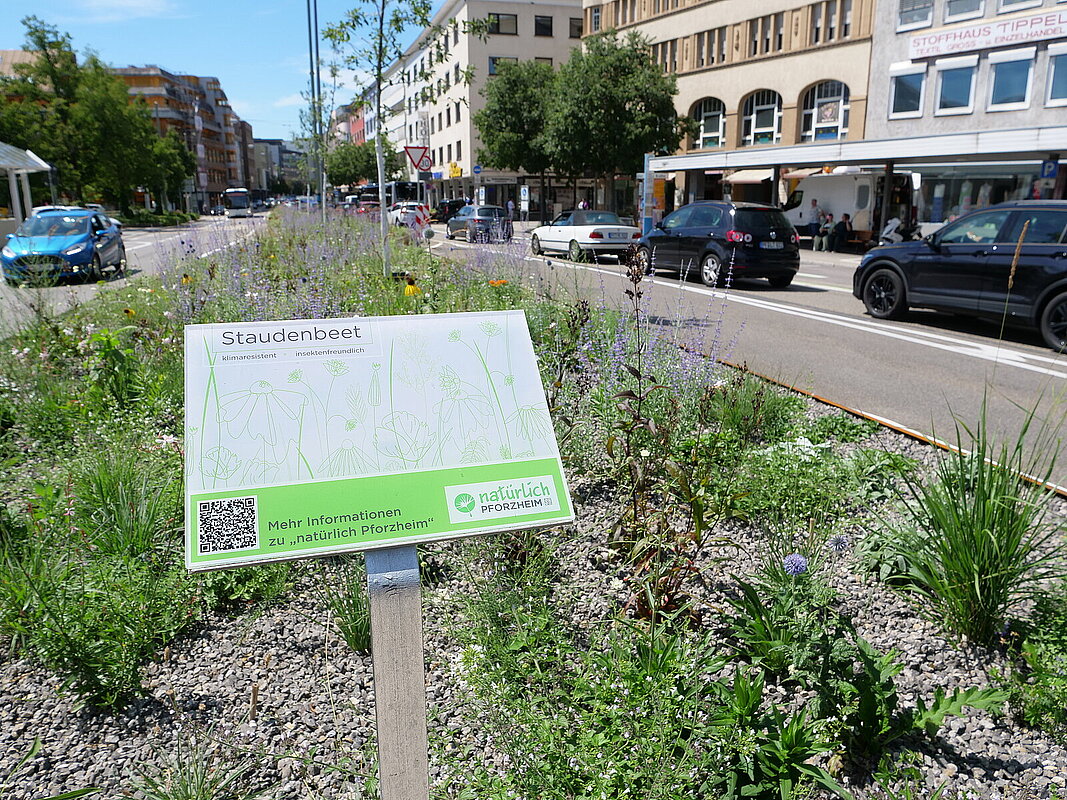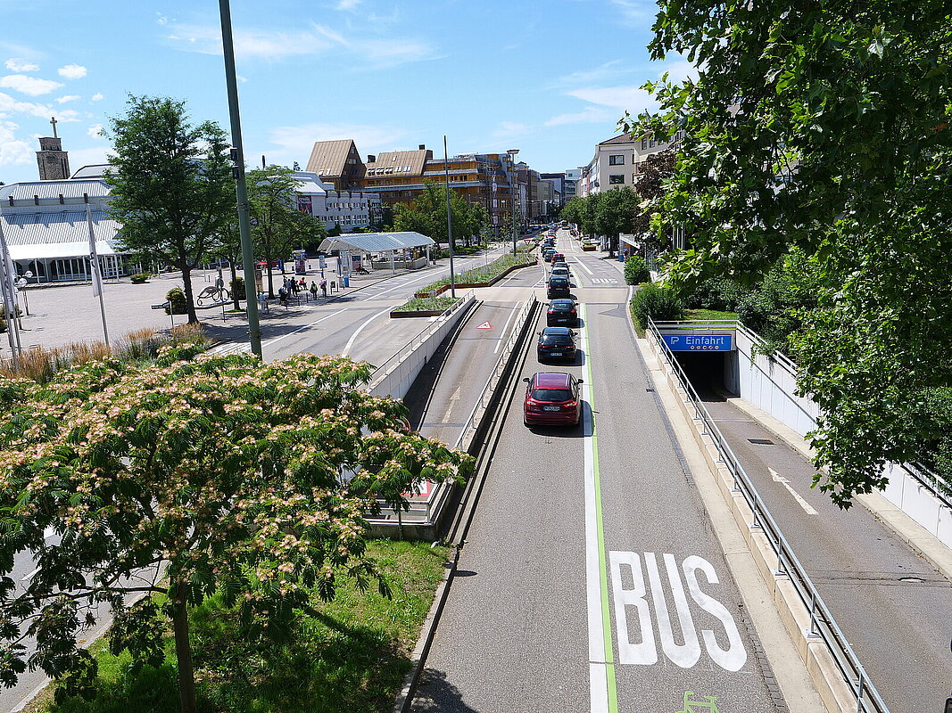 - Mehr Grün sorgt für mehr Aufenthaltsqualität. Zwischen den Fahrstreifen wurden daher hochstämmige Bäume gepflanzt und grüne Inseln, in die niedrige Stauden gesetzt wurden, errichtet.