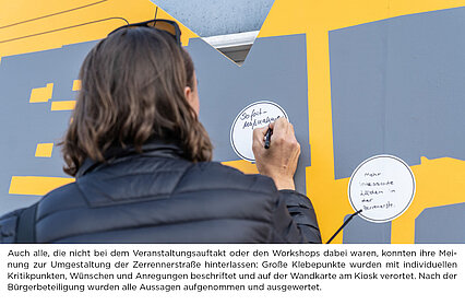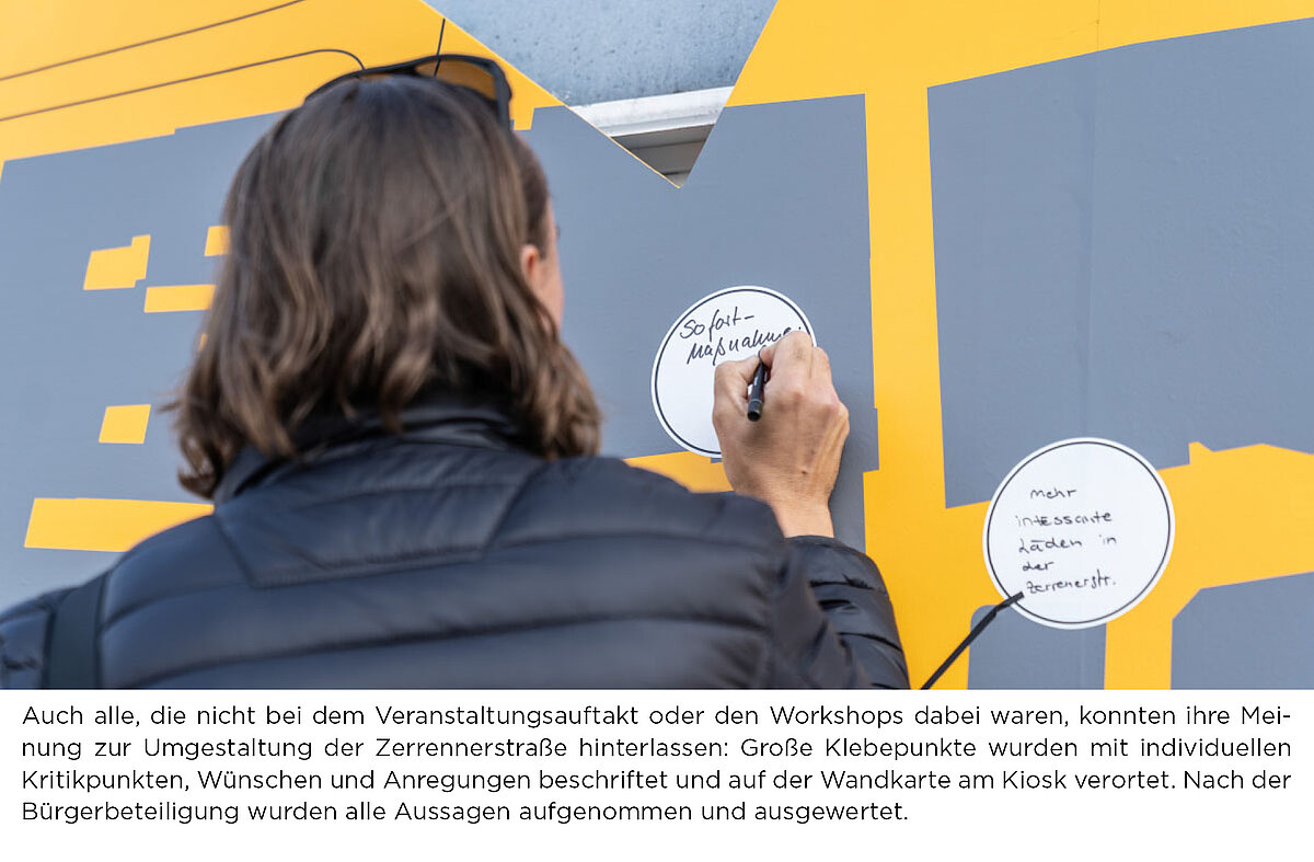 Auch alle, die nicht bei dem Veranstaltungsauftakt oder den Workshops dabei waren, konnten ihre Meinung zur Umgestaltung der Zerrennerstraße hinterlassen: Große Klebepunkte wurden mit individuellen Kritikpunkten, Wünschen und Anregungen beschriftet und auf der Wandkarte am Kiosk verortet. Nach der Bürgerbeteiligung wurde alle Aussagen aufgenommen und ausgewertet.