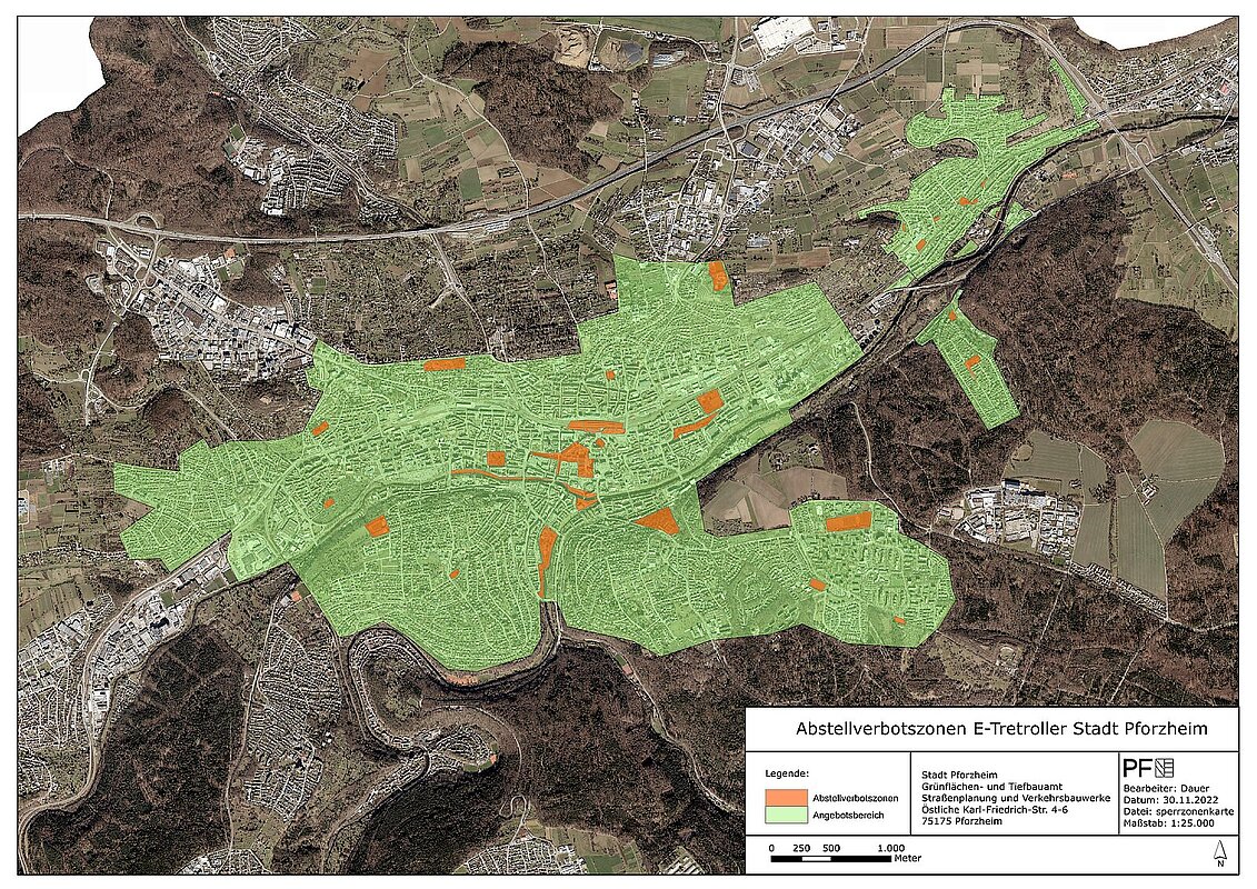 E-Tretroller dürfen nicht in Fußgängerzonen, in öffentlichen Grünanlagen, im Straßenbegleitgrün oder vor Rampen von Bahnabgängen sowie in öffentlichen Fahrradabstellanlagen abgestellt werden. Pforzheim hat Zonen definiert, in denen ein Miet-Ende und somit das Abstellen der E-Tretroller untersagt ist.
