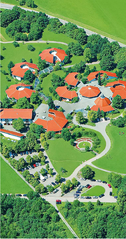 Das große Gebäude unter achteckigen Ziegeldächern fügt sich harmonisch ein in eine offene, beruhigende und zugleich inspirierende Wiesenlandschaft.