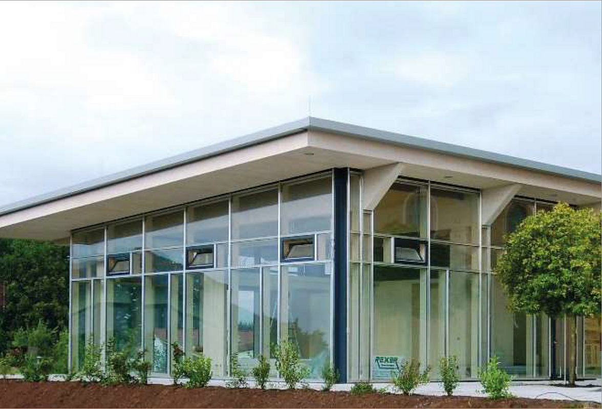 Blickverbindungen zur Galerie im Obergeschoss herstellt. Die markante Fassade wurde in Trapezblech ausgeführt.