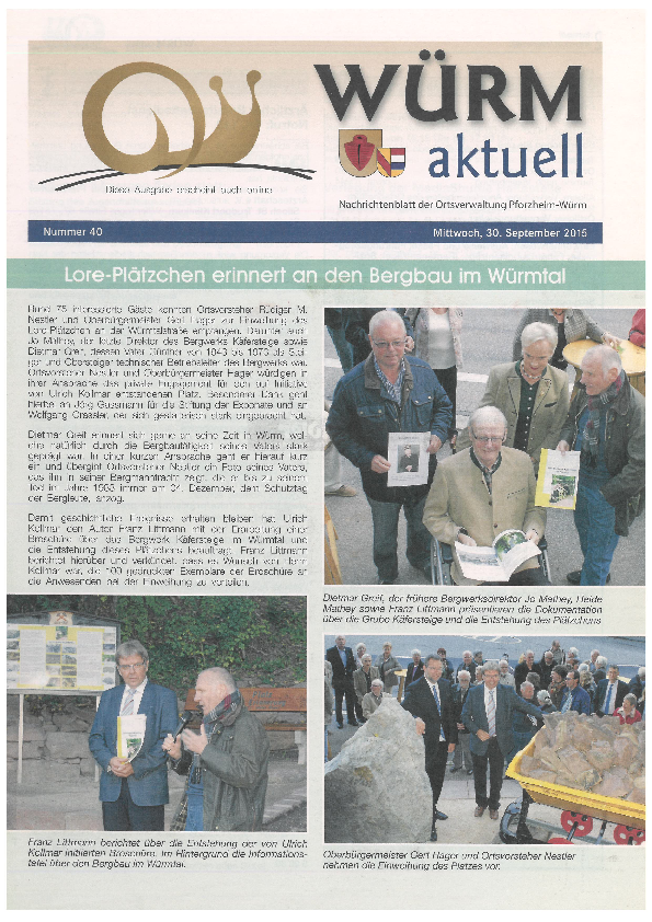 Der Platz wurde unter großem Interesse der Bevölkerung am 24.09.2015 offiziell eingeweiht. Im Zuge der Einweihung wurde  sowie die von Ulrich Kollmar beim Autor Franz Littmann beauftragte Broschüre "Das Bergwerk Käfersteige im Würmtal" vorgestellt und an die Anwesenden verteilt.  Die Broschüre legt die Geschichte um den Bergbau im Würmtal, die Grube Käfersteige, sowie die Entstehung dieses Platzes dar.