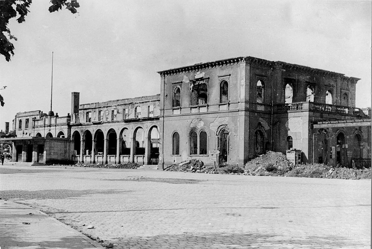 Am 23. Februar 1945 wurde der Hauptbahnhof durch Spreng- und Brandbomben getroffen. Die noch aufrecht stehenden Umfassungsmauern wurden in den Nachkriegsjahren zugunsten des Neubaus abgebrochen.
