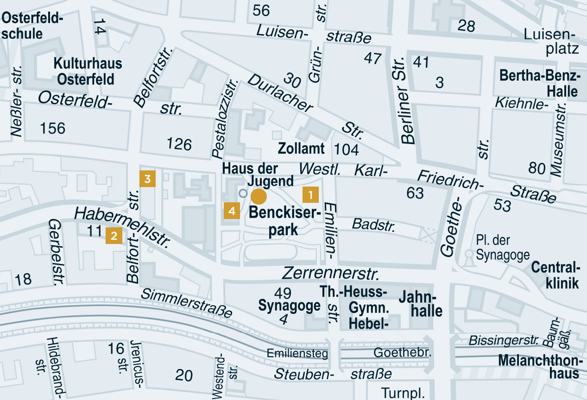 Auf den Grundmauern der kriegszerstörten Villa Benckiser wurde mit US-amerikanischer Unterstützung 1949 das Haus der Jugend errichtet und später mehrfach erweitert. Auf der Parkseite öffnet sich das Gebäude zu einer vorgelagerten Terrasse. Fritz Theilmann aus Kieselbronn schuf über dem Haupteingang an der Westseite ein Keramikwandbild mit dem Titel "Begegnung". Der beliebte Jugendtreff wurde mehrfach erweitert und präsentiert sich ab 2017 mit einem zusätzlichen Obergeschoss.