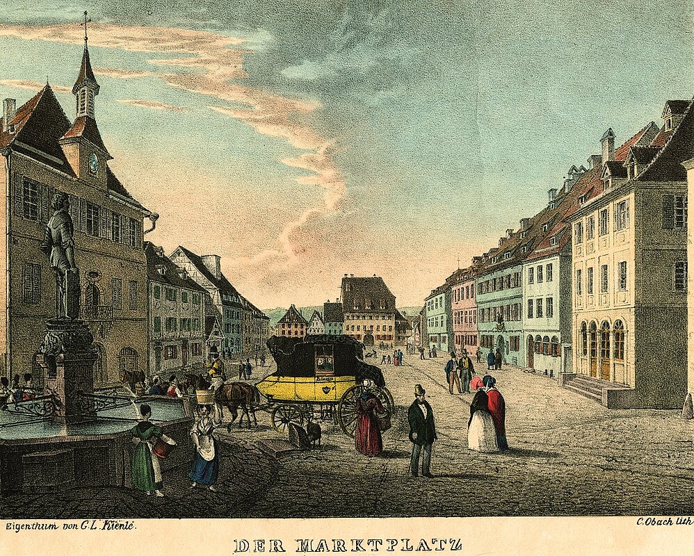 Der Marktplatz war in der zweiten Hälftedes 12. Jahrhunderts als Zentrum derstaufischen Neustadt planmäßig angelegtworden. An der Platznordseite stand der Marktbrunnen, der den messtechnischenMittelpunkt der mittelalterlichen Stadtanlagemarkierte. Er wurde 1548 mit einemStandbild geschmückt und nach dem regierendenFürsten Markgraf Ernst benannt.