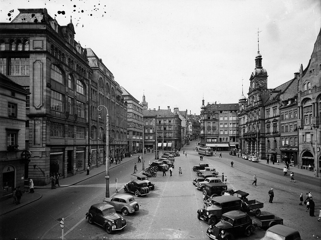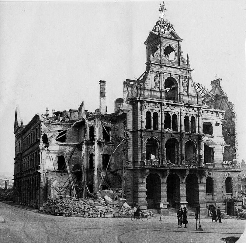 Beim Luftangriff vom 23. Februar 1945wurde die gesamte Platzbebauung schwerbeschädigt und anschließend abgeräumt, darunter auch das 1892–95 nach Plänen von Stadtbaumeister Alfons Kern errichtete Rathaus im Neorenaissancestil, das an der Ostseite des Marktplatzes stand.