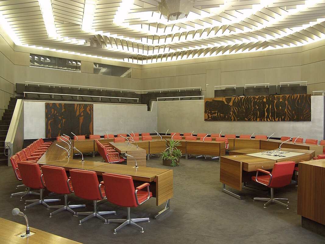 Das Interieur des Ratssaalgebäudes geht auf Entwürfe der Innenarchitektin Herta-Maria Witzemann zurück. Für die Brüstungen der Tribüne im Ratssaal schuf 1973 der Künstler HAP Grieshaber 13 hölzerne Relieftafeln, die verschiedene Motive aus der Stadtgeschichte zeigen. Das kleine Foyer des Ratssaals schmücken Figuren aus Gries habers Zyklus "Männerwald".