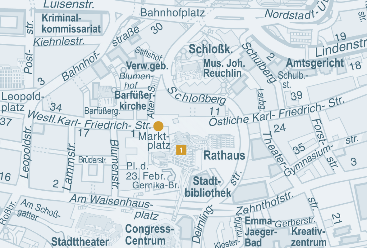 Mittelpunkt des modern wiederaufgebauten Stadtzentrums ist der Marktplatz mit dem Neuen Rathaus von 1973. Das Ratssaalgebäude teilt den Platzraum in einen oberen und einen unteren Marktplatz. Die ursprüngliche Platzgestaltung mit Wasserbecken, Pflanztrögen und gemustertem Belag nach Entwurf des Rathausarchitekten Rudolf Prenzel ist schon wieder Geschichte.