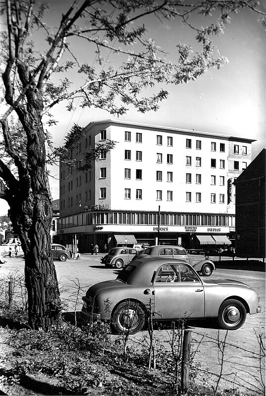 Auf dem Grundstück des ehemaligen "Palast-Cafés" errichtete der katholische Caritas-Verband 1948/49 nach Plänen von Theo Preckel und Eduard Wolf aus Pforzheim den Martinsbau als Wohnheim für "einzelstehende Personen" mit angeschlossenen Läden, Hotel und Gaststätte. Ein zeittypisches Motiv ist das vorspringende Erkerband im Obergeschoss.