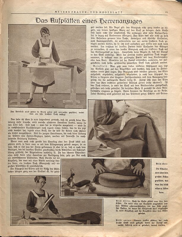 Die festlichen Tage sind vorbei und in so manchem Haushalt hängen möglicherweise verknitterte Herrenanzüge am Kleiderschrank. Mit dieser Archivale, einem Auszug aus der Zeitschrift "Meyers Schweizer Frauen- und Modeblatt" (Nr. 4, 6. Jahrgang vom 26. Januar 1929) zeigen wir, wie nah Archivalien am realen Leben sind. Diese Schweizer Frauenzeitschrift wurde von einer Pforzheimerin gelesen und mit ihren wichtigsten Unterlagen aufbewahrt. Mit der exakten Anleitung über „Das Aufplätten eines Herrenanzuges“ enthält sie praktische Tipps für „junge und erfahrene Hausfrauen“. Zwar sind in den meisten Haushalten Ärmelbrettchen, Bügelkissen oder Kleiderbürsten als Bügelhilfe verschwunden, doch die Bügeltechnik bleibt unverändert. Vielleicht gefiel der Pforzheimerin auch der Artikel über „Die Frau und der Beruf des Gatten“, die Unterweisung in die Schnurstrickerei oder es waren nur die hübschen Modezeichnungen von Interesse.