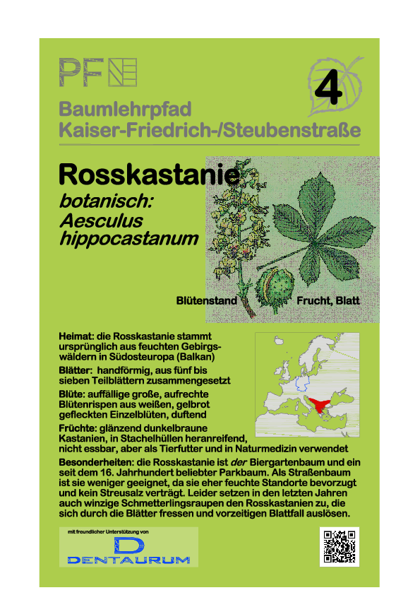 die Rosskastanie ist der Biergartenbaum und ein seit dem 16. Jahrhundert beliebter Parkbaum. Als Straßenbaum ist sie weniger geeignet da sie eher feuchte Standorte bevorzugt und kein Streusalz verträgt. Leider setzen in den letzten Jahren auch winzige Schmetterlingsraupen den Rosskastanien zu, die sich durch die Blätter fressen und vorzeitigen Blattfall auslösen.