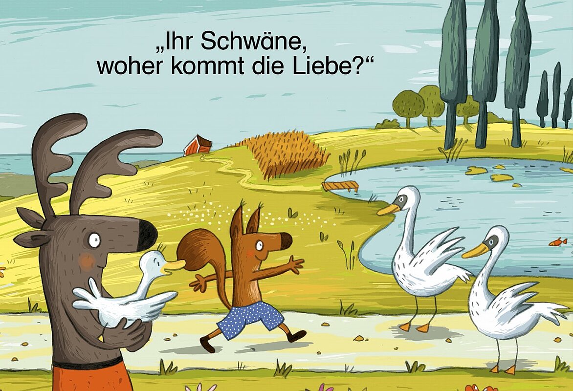 Eichhörnchen, Elch und Ente suchen nach der Liebe und hören wundersame Ansichten der Tiere. Ein Elchpups bringt die schönste Erkenntnis – eine poetische Geschichte über Gefühle und Philosophieren.