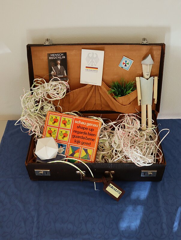 Im Projekt „Demokratiekoffer“ gestalten acht Gruppen aus der Kulturregion Nordschwarzwald ihren eigenen Koffer und machen sichtbar, was Demokratie für sie bedeutet. Nach einem inhaltlichen Input zur Entwicklung der Demokratie in Deutschland durch den Theaterkünstler Raphael Mürle und den Leiter des DDR-Museums Pforzheim, Moritz Bach, setzen die Teilnehmenden unter der Anleitung von der Künstlerin Sibylle Burrer ihre Vorstellungen kreativ in Objekten um.