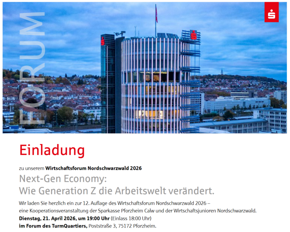 Wir laden Sie herzlich zur 12. Auflage des Wirtschaftsforum Nordschwarzwald 2026 – eine Kooperationsveranstaltung der Sparkasse Pforzheim Calw und der Wirtschaftsjunioren Nordschwarzwald ein. Unter dem Titel: