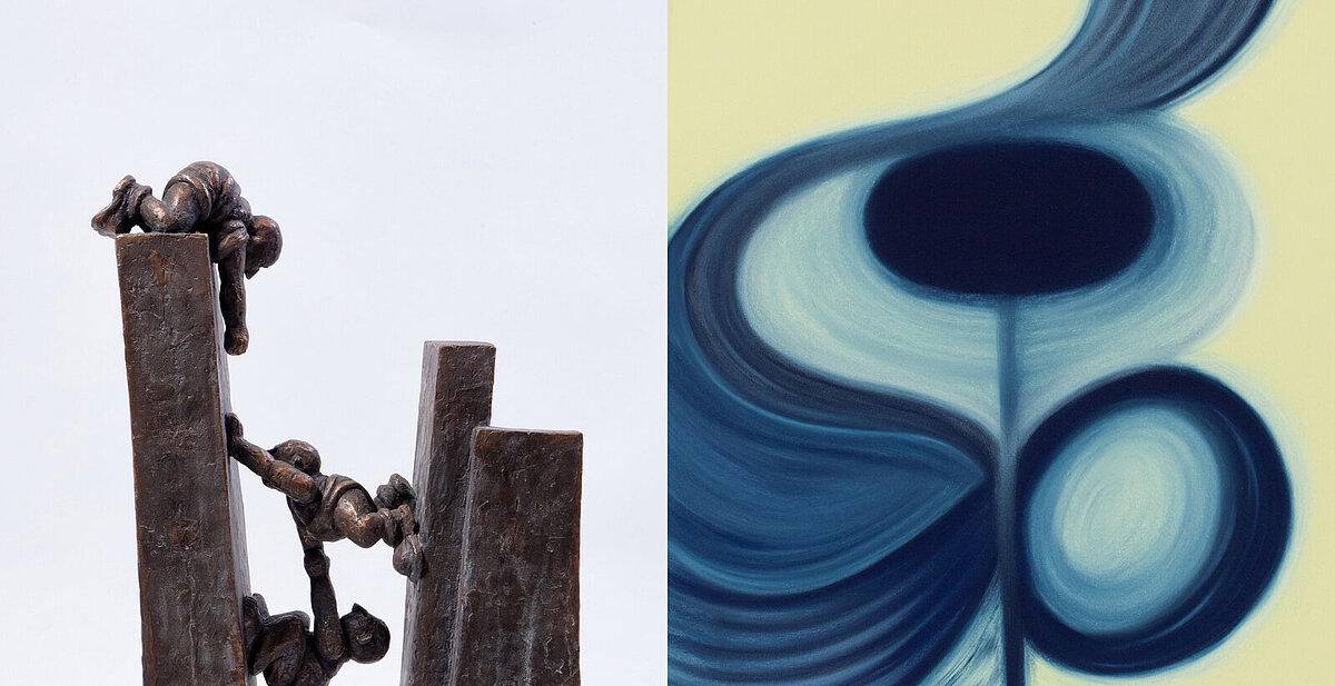 Andreas Futter ist ein Erfinder herrlich absurder Situationen.Seine bronzenen Figurinen sind gekennzeichnet durch ironische Distanz und augenzwinkernden Witz. Rose Stoll ist eine Künstlerin, deren Werke mit einer außergewöhnlichen Klarheit und Reinheit ausgestattet sind.Mit Pastellkreide auf Papier spricht sie die inneren Kräfte der Themen und Menschen an, die sie abstrakt darstellt.